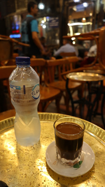 咖啡香濃可口,即使算是炎熱(但乾爽)的夜晚,一杯熱騰騰的黑咖啡仍然感到非常幸福! 說起熱飲,不得不提: 雖然在酷熱的沙漠/ 沙漠城市裡整天走來走去,一杯冰凍的飲料(包括果汁等)是非常的誘人,但強烈建議在埃及切忌飲用任何非罐裝樽裝凍飲尤其是加冰飲品! 除非是高級酒店或餐廳,不論是街邊檔或一般餐廳(即使是遊客區內)都不宜 - 凍飲/ 加冰飲品是高風險“搞肚痛”之物! 話說,我第二次遊歷哈利利市場時就在某咖啡館內飲了杯凍芒果汁就“出事” – 當晚立即就開始輕微肚瀉,幸好daypack內一直有“平安藥”隨身,兩三天後自癒。